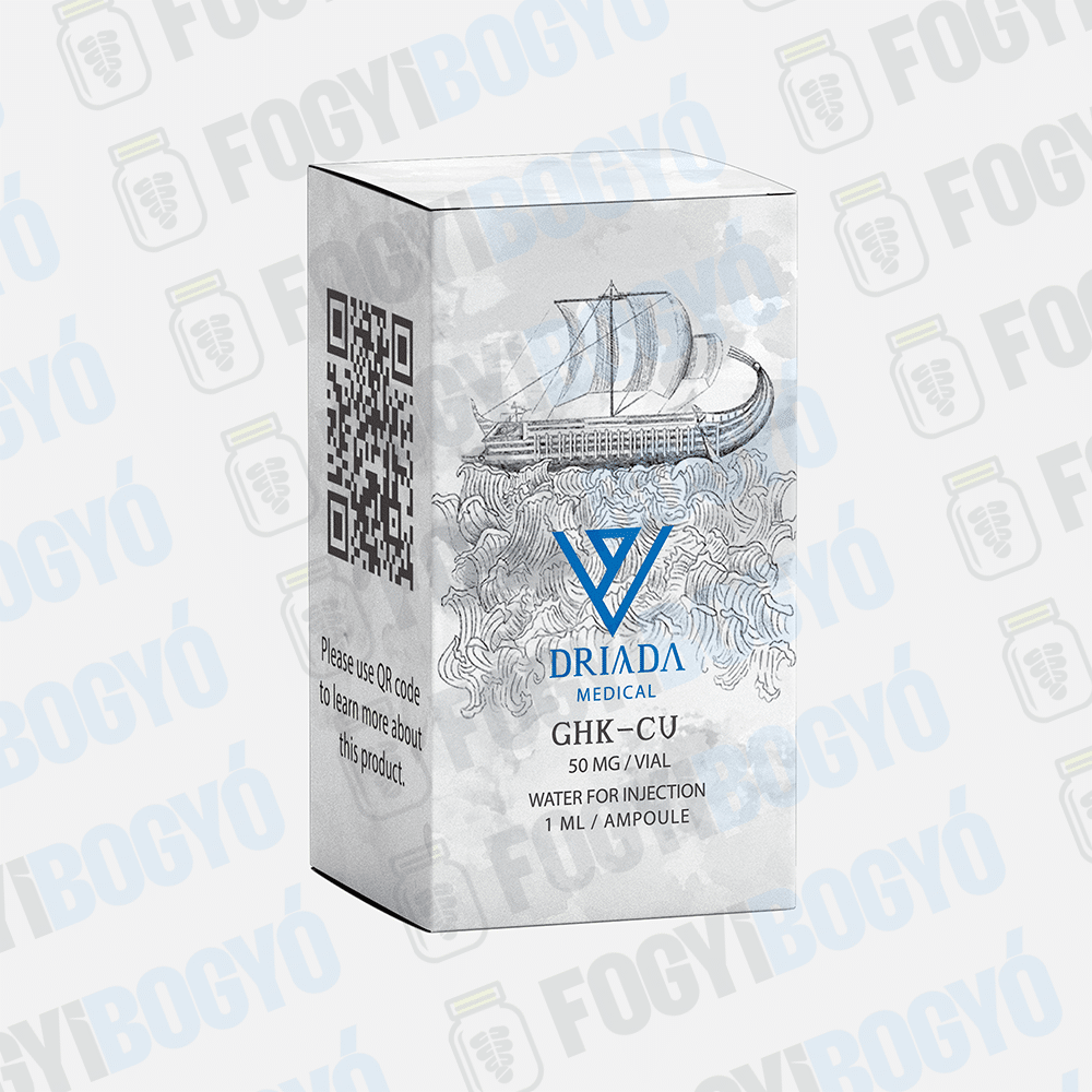 A Driada Medical GHK-Cu 50 mg nem tabletta vagy kapszula formában kapható, hanem kutatási peptidként, liofilizált porral töltött injekciós üvegben (vial) érkezik. A termékhez általában tartozik egy ampulla (vagy külön vásárolható) injekciós víz (steril vagy bakteriosztatikus víz), amellyel a port fel kell oldani (rekonstituálni) használat előtt.