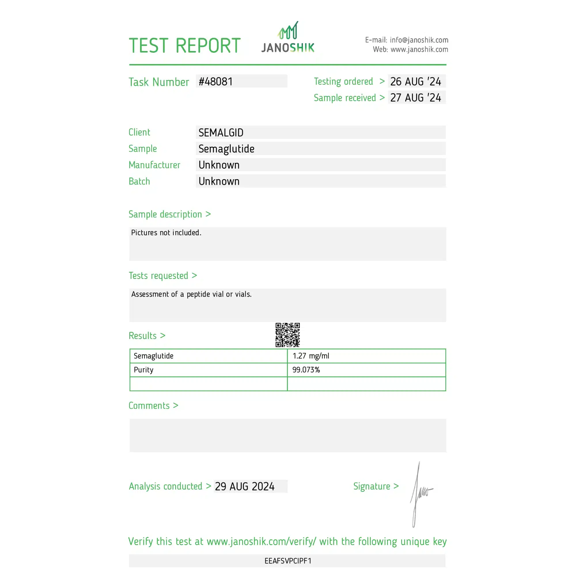 A New Generation Pharma elkötelezett a minőség és az átláthatóság iránt. A Semalgid 4mg szigorú, független laboratóriumi vizsgálatokon esett át, például a JanoshiK Laboratory által, amely igazolta a semaglutide 1,27 mg/ml koncentrációját és 99,07%-os tisztaságát. Ezek az eredmények garantálják, hogy a termék megfelel a legmagasabb iparági standardoknak, így a felhasználók teljes bizalommal alkalmazhatják a fogyás és az egészség javítása érdekében. A laboratóriumi jelentések nyilvánosan elérhetők a gyártó weboldalán, ami tovább növeli a termék hitelességét és a vásárlók bizalmát.