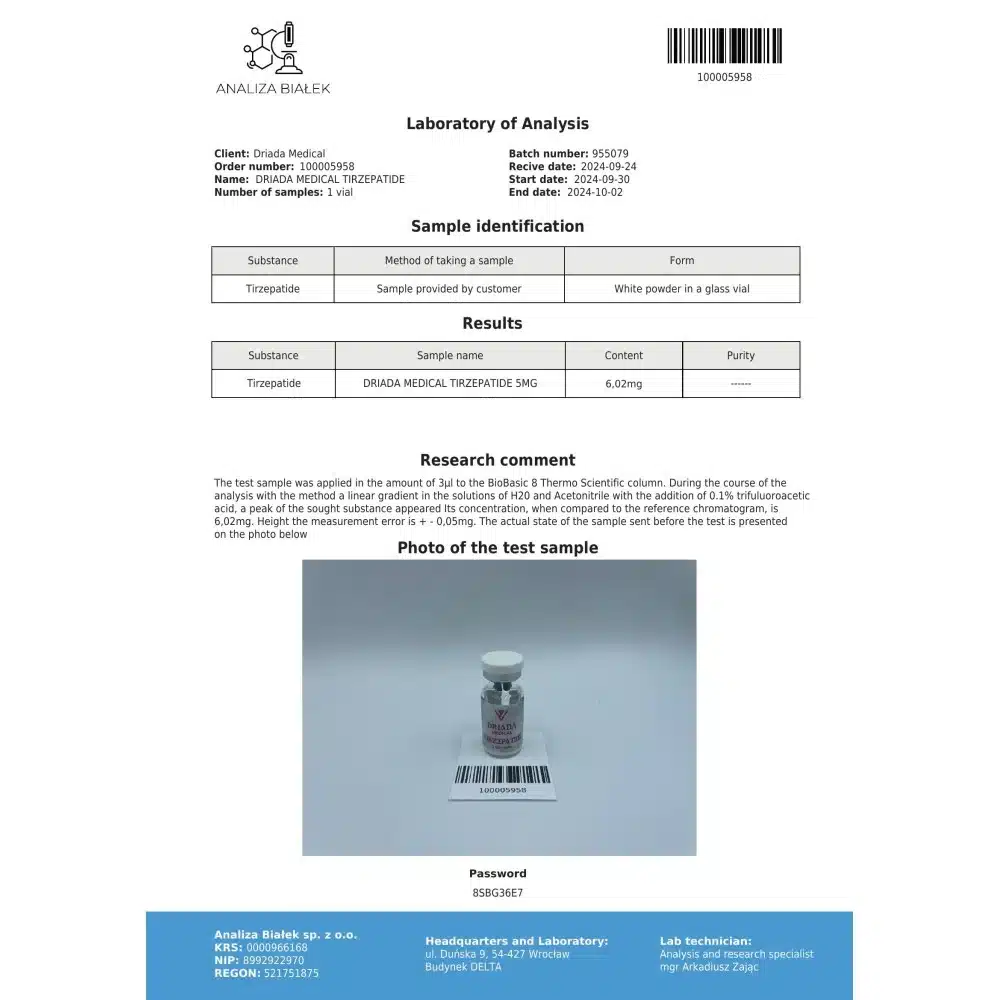 A Driada Medical Trizepatide 5mg minőségét a Janoshik Analytical laboratórium független tesztelése garantálja, amely a gyógyszerészeti ipar vezető analitikai szolgáltatója. A Janoshik HPLC és más fejlett módszereket alkalmaz a trizepatid tisztaságának és pontos 10 mg-os hatóanyagtartalmának ellenőrzésére. Ez a tanúsítvány biztosítja, hogy a Trizepatide fogyasztószer megbízható és hatékony, így maximális bizalommal használhatod fogyási céljaid elérésére. A Janoshik bevizsgálás megerősíti a Driada Medical elkötelezettségét a prémium minőség iránt.